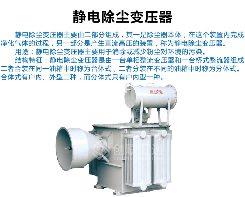 靜電除塵變壓器適合于工業(yè)部門的除塵、除霧、脫水、雜質(zhì)分離和回收稀有金屬及其他原料等方面應用。
