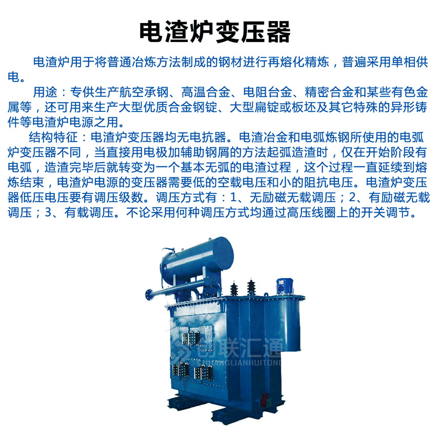 電渣爐變壓器電渣爐變壓器均無電抗器,專供生產航空承鋼、高溫合金、電阻臺金、精密合金和某些有色金屬等,還可用來生產大型優質合金鋼錠、大型扁錠或板坯及其它特殊的異形鑄件等電渣爐電源之用。